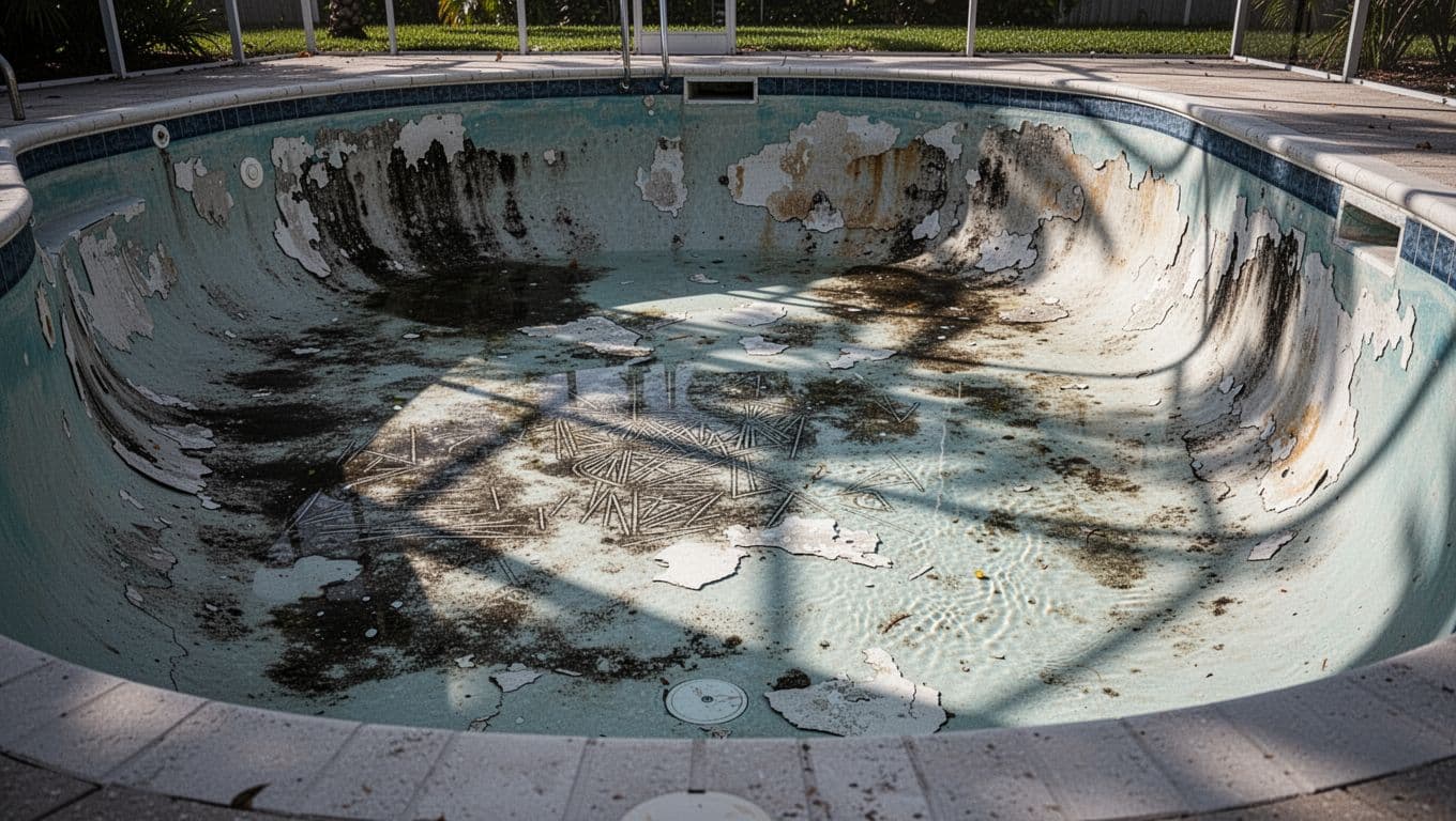 Then there's discoloration. Mottling, patchy shading, or areas that no longer match the rest of the pool can point to age, chemical damage, or uneven wear. Flaking and chipping are more serious. When pieces of finish start coming loose, the surface is usually past the point of simple spot treatment.
